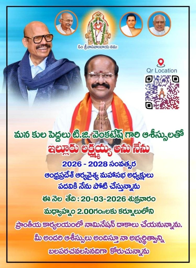 ప్రస్తుతం 2026 – 2028 సంవత్సర పదవి కాలానికి ఈసారి రాయలసీమ జోన్ కు వచ్చినందున ఆంధ్రప్రదేశ్ ఆర్యవైశ్య మహాసభ అధ్యక్ష పదవికి మీ ఇల్లూరు లక్ష్మయ్య గా పోటీ చేయుచున్నాను, ఈనెల 20వ తారీఖున శుక్రవారం మధ్యాహ్నం రెండు గంటలకు కర్నూల్ లోని ఆంధ్రప్రదేశ్ ఆర్యవైశ్య మహాసభ రీజనల్ ఆఫీసు, కర్నూలు లో నామినేషన్ వేయుచున్నాను, కావున ఆర్యవైశ్య సోదర సోదరీమణులు అందరూ ఈ కార్యక్రమంలో పాల్గొని నన్ను ఆశీర్వదించి ఎన్నికల్లో గెలిపించవలసిందిగా కోరుతున్నాను., నమస్కారములతో