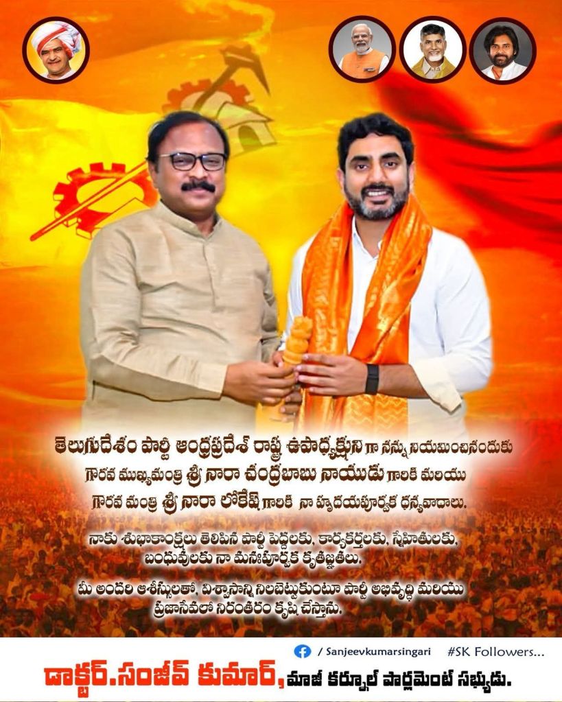 తెలుగుదేశం పార్టీ ఆంధ్రప్రదేశ్ రాష్ట్ర ఉపాధ్యక్షునిగా నన్ను నియమించినందుకు గౌరవ ముఖ్య మంత్రి శ్రీ నారా చంద్రబాబు నాయుడు గారికి మరియు గౌరవ మంత్రి శ్రీ నారా లోకేష్ గారికి నా హృదయపూర్వక కృతజ్ఞతలు.