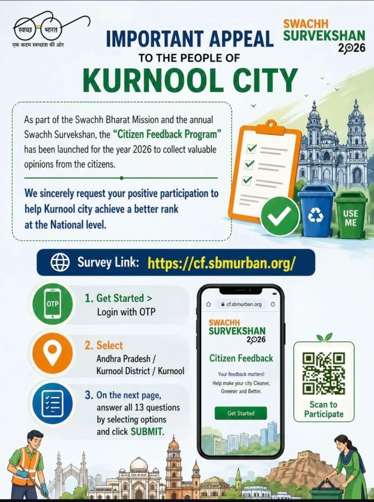 కర్నూల్ మున్సిపల్ కమిషనర్CH ఓబులేసు ఒక ప్రకటనలో ప్రజల నుంచి ఫీడ్ బ్యాక్ కోసం స్వచ్ఛ సర్వేక్షన్ కోసం పైన ఇచ్చిన లింక్ ను ఓపెన్ చేసి otp ద్వారా లాగిన్ అయ్యి కర్నూలు డిస్ట్రిక్ట్ కర్నూల్ సిటీ ఎంచుకొని అక్కడ ఇచ్చిన 13 క్వశ్చన్ లు ఆన్సర్ చేసి సబ్మిట్ చేయాలి అని కోరారు! లేదా స్కాన్ ద్వారా కూడా లాగిన్ అవ్వచ్చు!దీనివలన మరింత త్వరిత గతిన ప్రజలకు సేవ చేసే అవకాశం కలుగుతుంది! మీ ఫీడ్ బ్యాక్ ఆధారం గా కావలసిన మార్పులు చేసి మరింత వేగంగా ప్రాబ్లమ్స్ సాల్వ్ చేసే అవకాశం కలుగుతుంది! కావున ప్రజలందరూ మీ ఫీడ్ బ్యాక్ ఇవ్వాలి అని తెలిపారు!